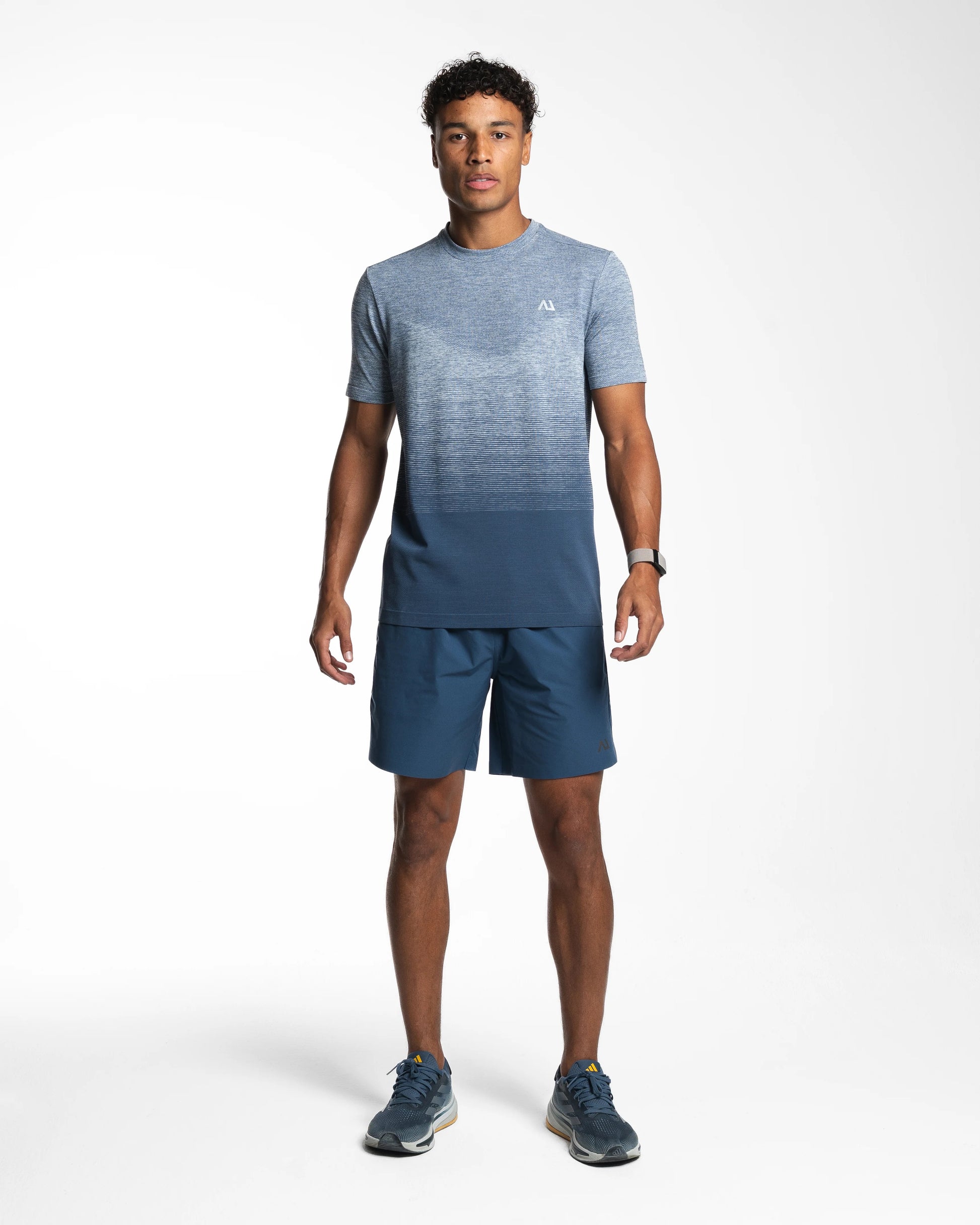 Built to perform, styled to move. The Azure Blue Seamless Gradient Set pairs a lightweight, moisture-wicking tee with technical, water-resistant shorts — both engineered for running, training, and everything in between. With a breathable feel, athletic fit, and clean gradient finish, this set delivers comfort and sharpness in every stride. Sizing - Athletic Fit - Model is 5'11/30 Waist and is wearing a Medium T-shirt and Small Shorts